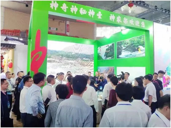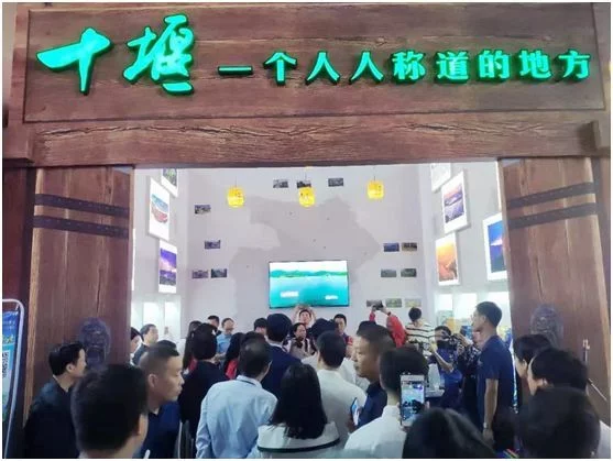 十堰展台设计以“十堰,一个人人称道的地方”为主题,以十堰民居和现代民宿为主要元素。整体设计充分利用了现有空间,用20张图片展示了仙山、秀水、汽车城,10个展柜展示了带有地域特色的农产品和文创产品。一张十堰区域地图标注了十堰乡村旅游的精华点,地图中央的电视上播放着《十堰,一个人人称道的地方》专题片。
