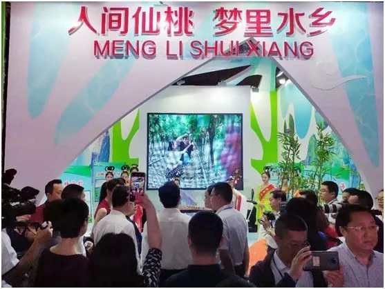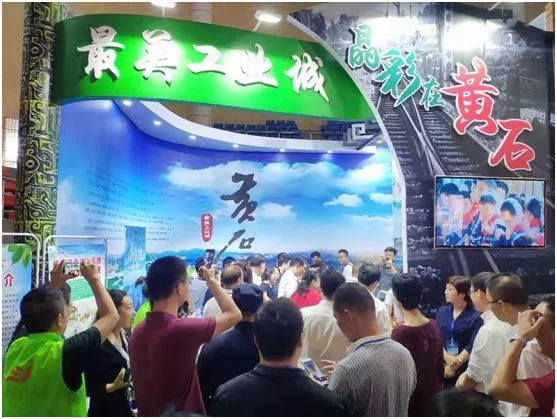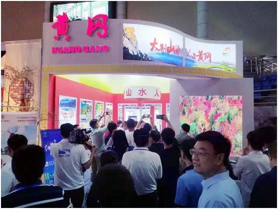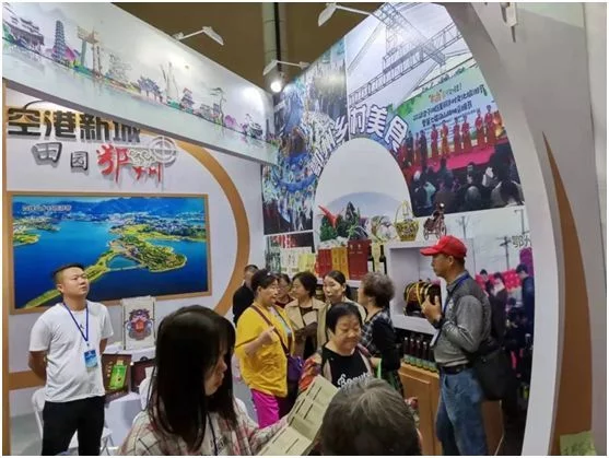 鄂州展台的设计理念主要是结合“空港新城”和“田园鄂州”两大主题,结构简洁大方,墙面背景整合鄂州乡村美景、乡村美食和乡村旅游节庆活动,主体为曲线结构,紧扣鄂州城市形象,推介鄂州乡村文化旅游产品。
